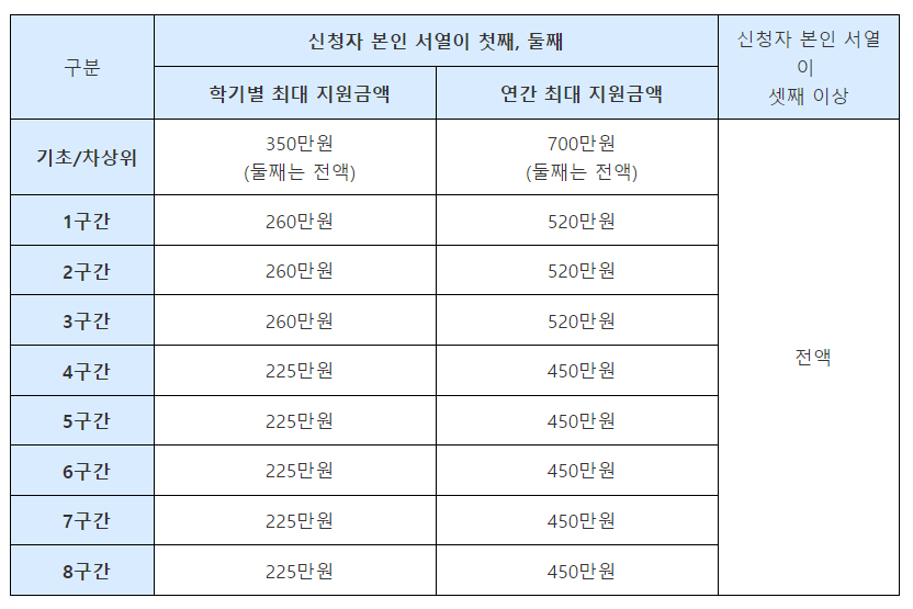 다자녀 국가장학금과 별도로 기초생활수급자, 차상위 가구는 첫째가 700만 원, 둘째부터 국가장학금 전액을 지원받을 수 있습니다.