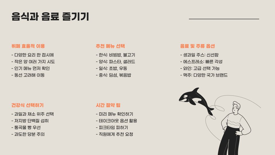 • 다양한 음식과 음료가 제공되어 여행 전 에너지를 충전할 수 있습니다.