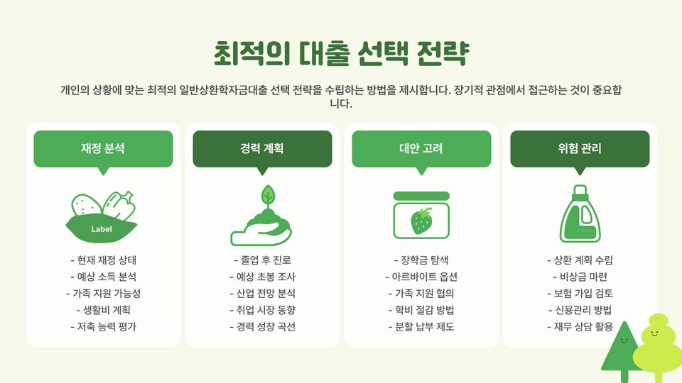 가장 이상적인 대출 선택은 이자율이 지나치게 높지 않고, 상환 조건이 유연한 상품을 선택하는 것입니다. 예를 들어, 상환 유예 기간을 제공하는 대출은 졸업 후 직장에 들어가서 안정적인 수입을 갖게 되기 전까지 쏠리는 부담을 줄여줄 수 있습니다.