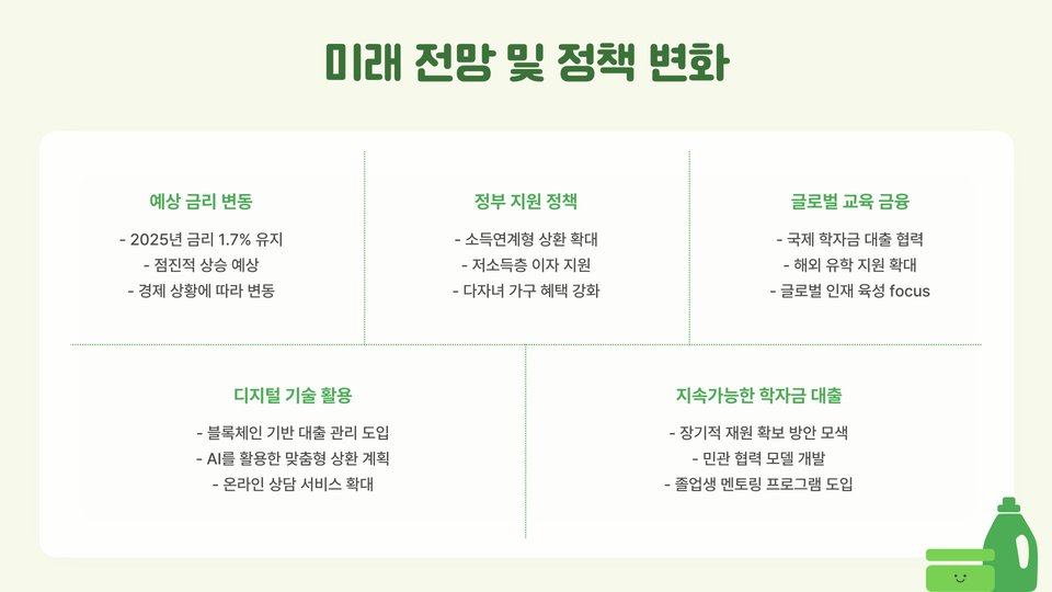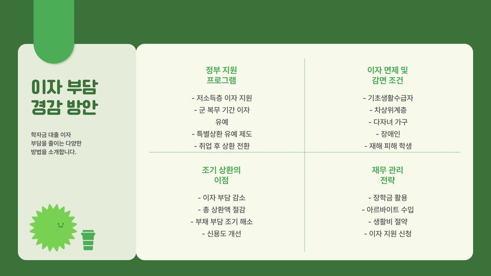 - 상환 유예 기간: 졸업 후 상환 시작 시점이 언제인지 확인하세요.