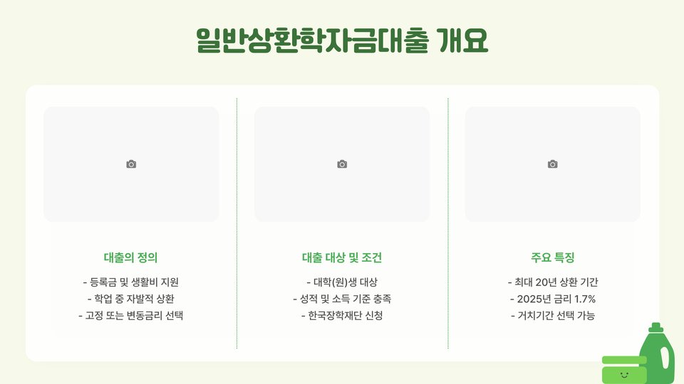 일반상환학자금대출은 대학생들이 학비를 부담하기 위해 정부 또는 금융기관에서 제공하는 대출입니다. 이 대출은 졸업 후 일정 기간이 지나면 상환을 시작해야 하며, 이자가 붙습니다. 가장 큰 장점은 학업 기간 동안 이자 납부가 면제된다는 점입니다. 따라서, 졸업 후 안정된 직장을 구한 뒤에 상환을 시작할 수 있어 부담이 덜합니다.
