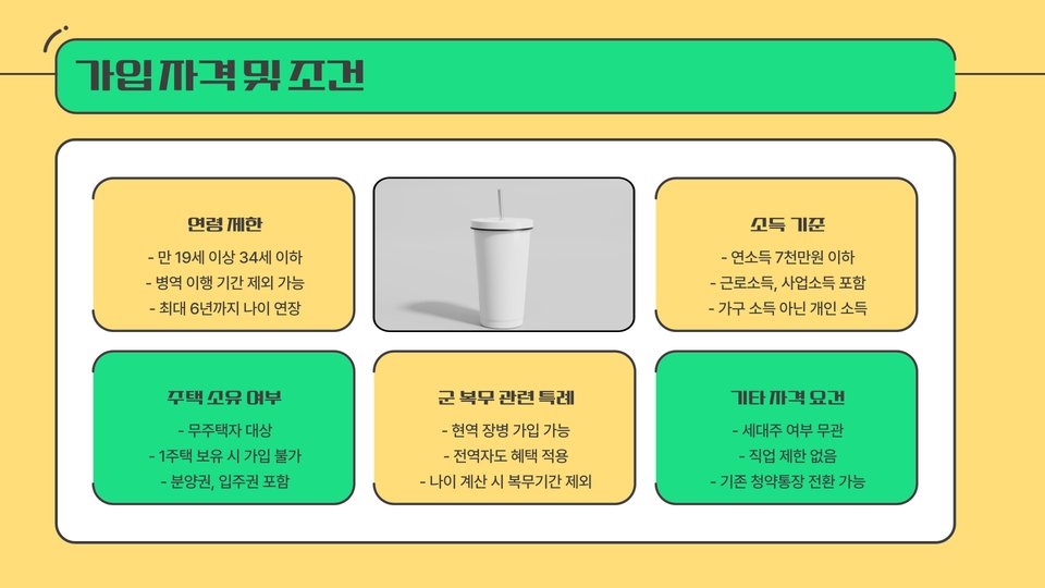 - 가입 자격은 만 19세 이상 39세 이하, 소득 기준 충족입니다.