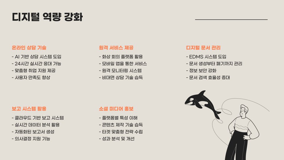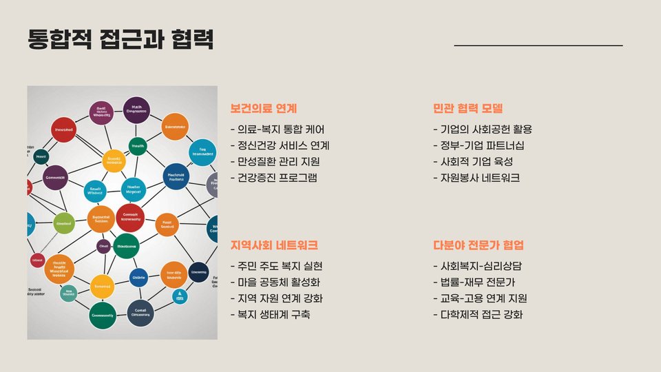 | 현재 이슈 | 고령화, 빈곤층 증가, 정신 건강 문제 |
