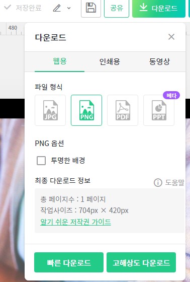 마무리 작업을 하여 깔끔하게 정리가 되면 다운로드를 합니다. 오른쪽 상단에 다운로드를 클릭합니다. 다운로드 화면에 웹용, 인쇄용, 동영상 탭이 있는데 웹용을 선택합니다. 파일 형식은 사용할 형식으로 선택 합니다. PNG 옵션에 투명한 배경은 이미지만 보이고 배경은 투명하게 되어 있는 파일 형식입니다. 오른쪽 아래에 고해상도 다운로드를 클릭하여 다운로드합니다.